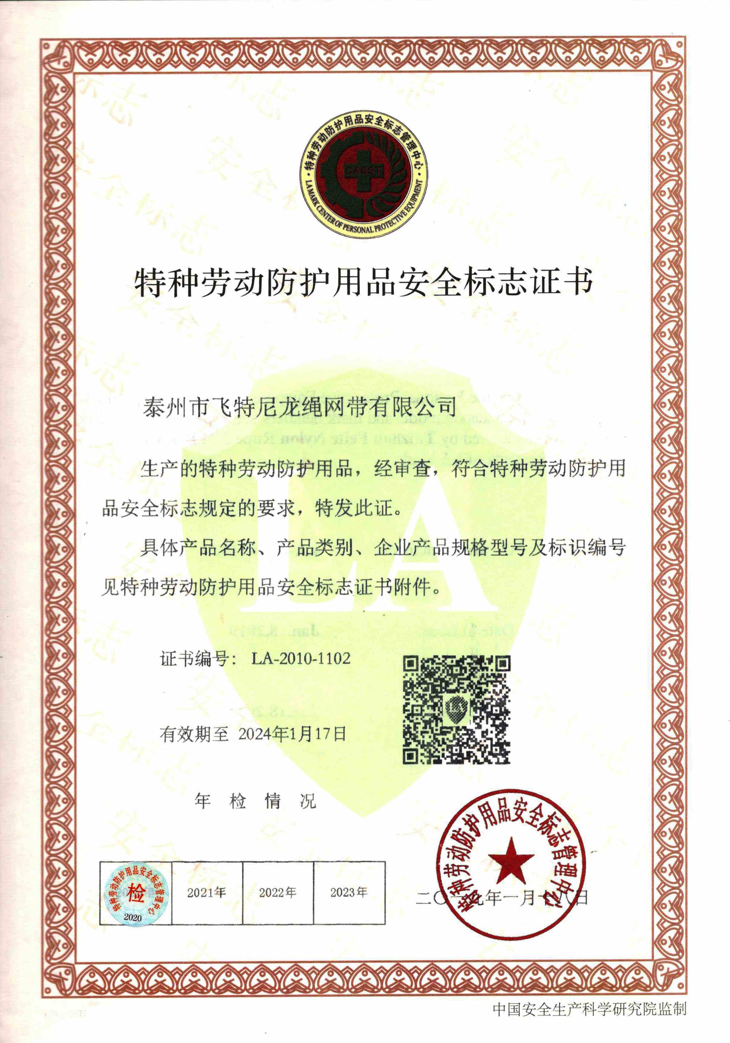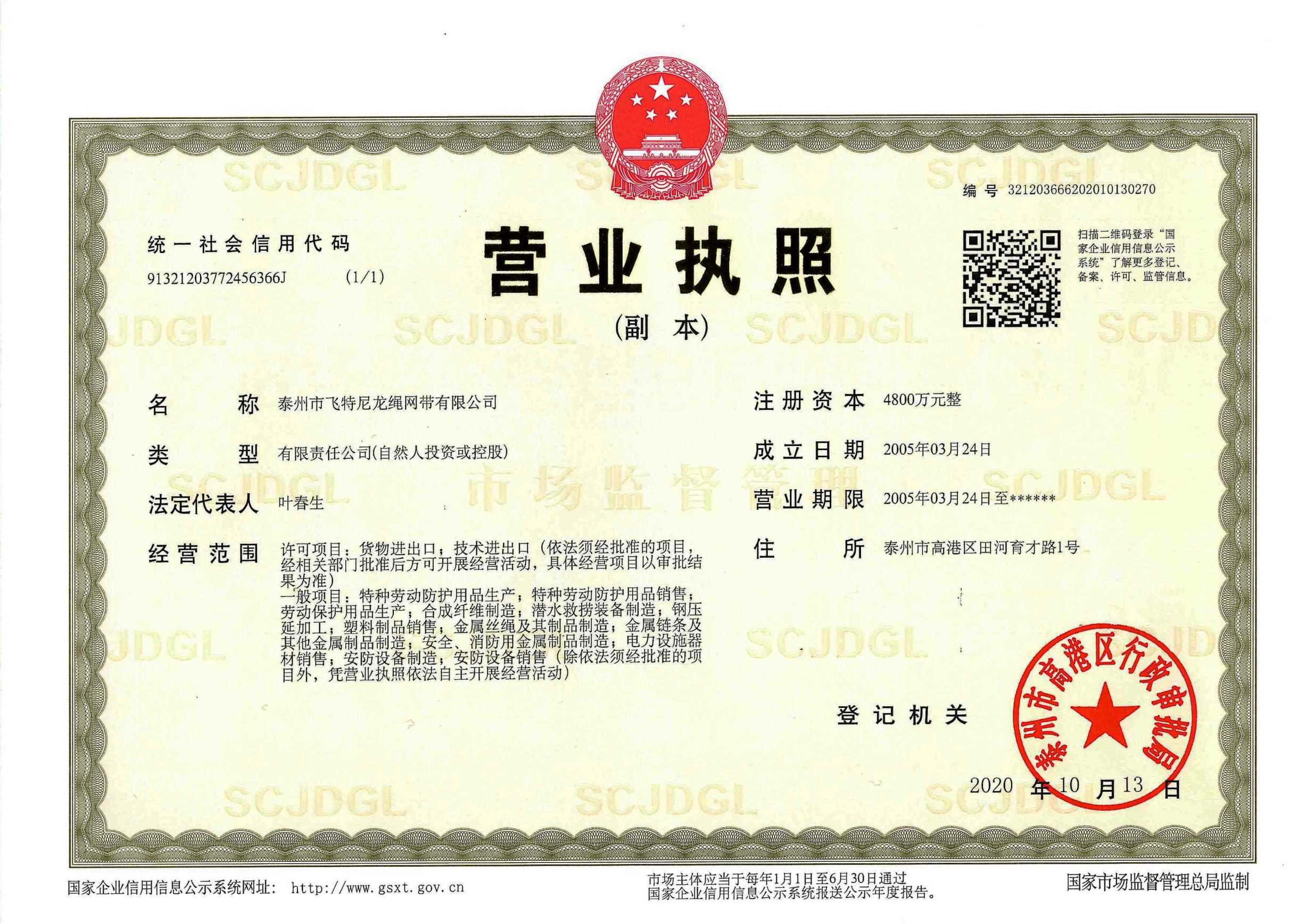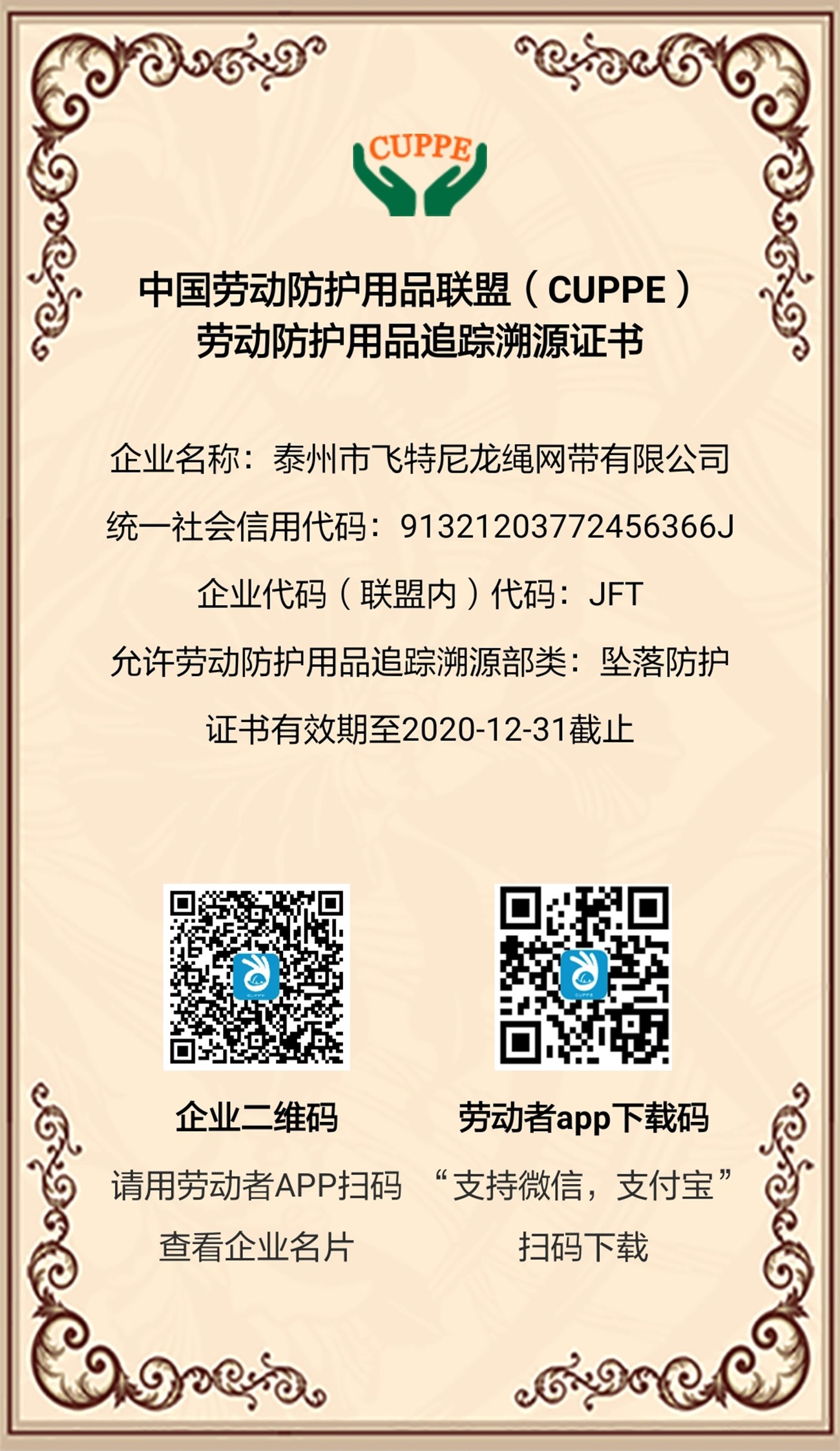泰州市飞特尼龙绳网带有限公司成立于2005年3月,占地面 积5600平方米,目前注册资金4800万元,位于古老而文明的长江 三角洲泰州市,诚实、热情的飞特人,用自己独具特色的方式创导着 个人高空作业安全防坠落行业的文明。我们所推崇的不仅仅是高质量 的产品,更重要的是:缔造使我们的顾客毫无后顾之忧的工程典范 。